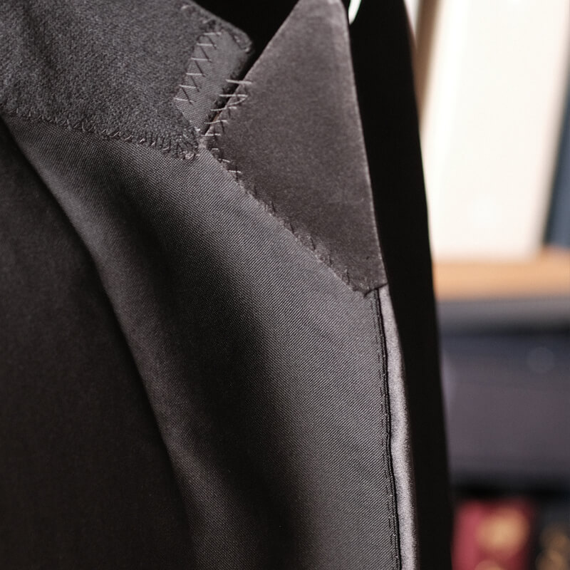 スーツはジャケット本体と同じ生地(ウールなど)で作られていますが、タキシードは襟にポリエステル・シルク(拝絹:はいけん)という光沢のある生地が貼られています。